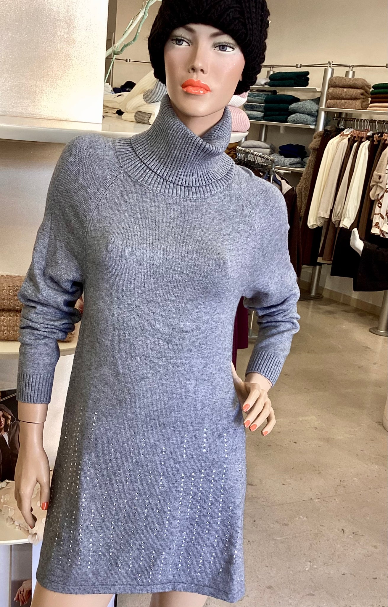 Questo abitino in maglia combina raffinatezza e comfort grazie al suo collo alto leggermente svasato impreziosito da piccoli strass che donano un tocco di eleganza discreta. Realizzato in un morbido mix di viscosa, poliestere e nylon, assicura calore e facilità di movimento, ideale per chi desidera uno stile sofisticato senza rinunciare alla praticità. Perfetto per occasioni in cui il comfort incontra la classe.