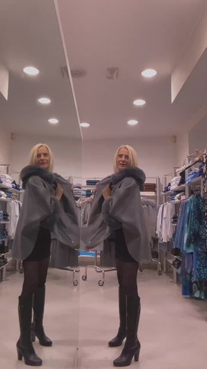 Questa mantella in tessuto di lana, arricchita da collo e polsi in eco pelliccia, si distingue per eleganza e versatilità. Il cinturino in ecopelle aggiunge un dettaglio raffinato, rendendo il capo perfetto per ogni occasione e abbinamento. Realizzata con cura in Italia, unisce stile sofisticato e comfort senza tempo.