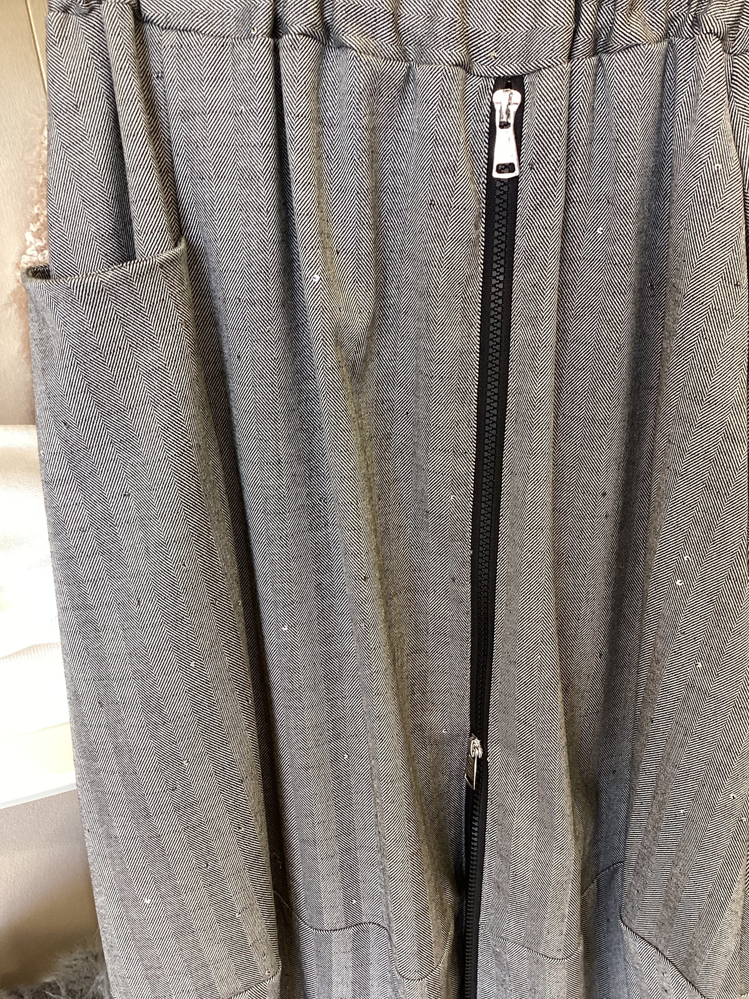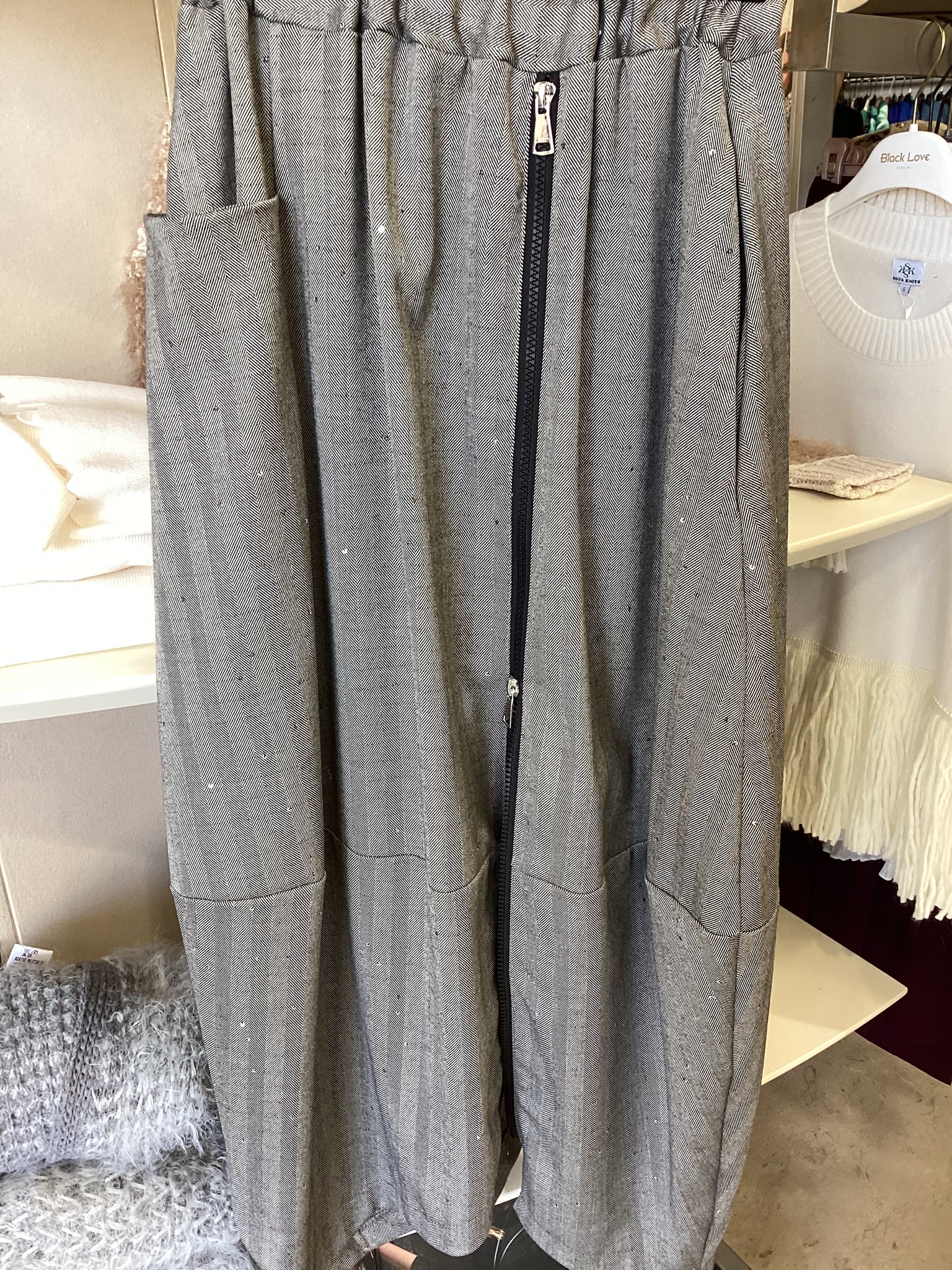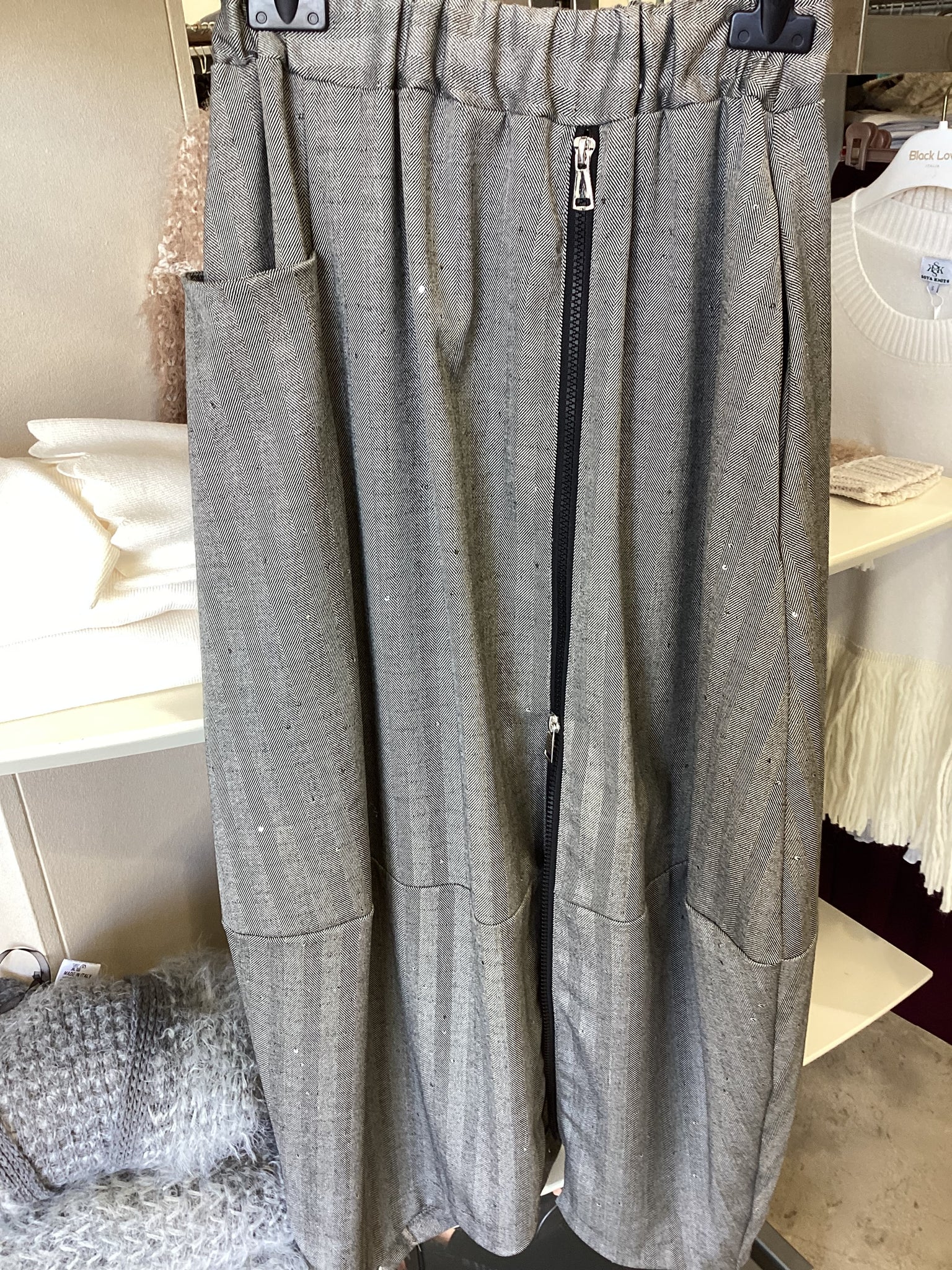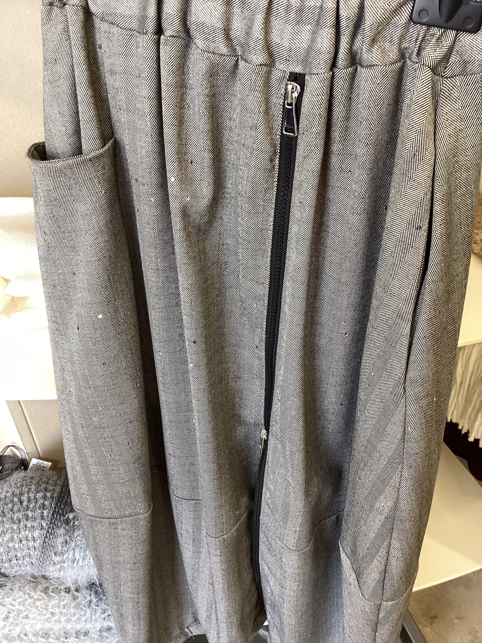 Questa gonna ampia in tessuto spinato con paillettes unisce eleganza e comfort. L’elastico alto in vita garantisce una vestibilità perfetta, mentre la cerniera a tutta lunghezza rende facile indossarla. Con una tasca a vista e una nascosta, unisce praticità a stile. Realizzata in Italia con una raffinata composizione di misto viscosa, è la scelta ideale per un look sofisticato e versatile.
